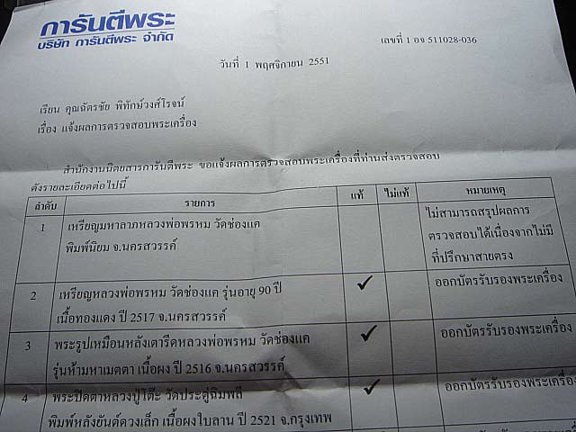 วันนี้ ได้รับพระที่ส่งไปออกบัตรรับรองหลายรายการแต่มีอยู่ 1 รายการ คือเหรียญมหาลาภ หลวงพ่อพรหม พิมพ์นิยม เม็ดงา ผลการตรวจสอบคือ ไม่สามารถสรุปผลการตรวจสอบได้ เนื่องจากไม่มีที่ปรึกษาสายตรง