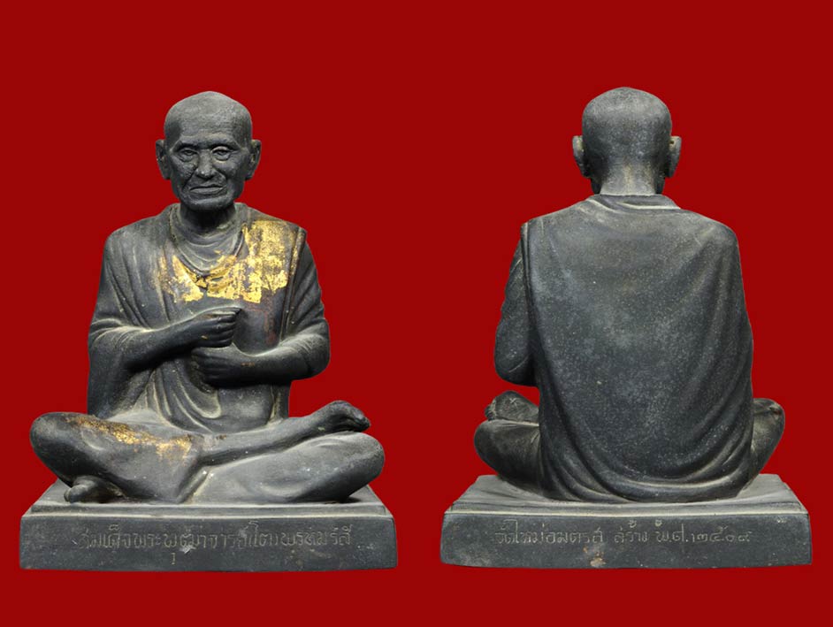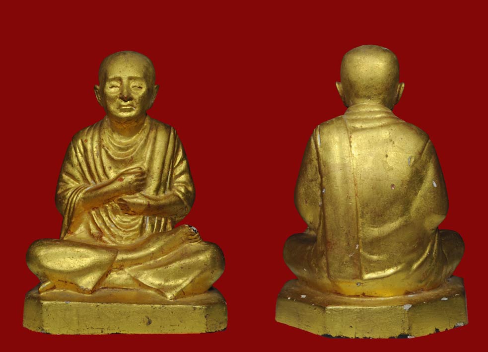 พระบูชาออกปี2509รุ่นแรกสร้างและปลุกเสกพร้อมพระผงปี09ครับ พระรูปเหมือนเนื้อปูนแกะบล็อกโดยลุงแฉล้มบัวเปลี่ยนสีครับ โดยในองค์พระบรรจุชิ้นสมเด็จพระบางขุนพรหมชำรุดเอาไว้เขย่าจะมีเสียงดังครับ ส่วนพระเนื้อโลหะจัดสร้างแกะแบบโดยนายช่างเกษม มงคลเจริญฝังชิ้นสมเด็จบางขุนพรหมไว้เช่นกันครับแต่เขย่าจะไม่มีเสียงดังเนื่องจากชิ้นพระได้ห่อไว้ด้วยหนังสือพิมพ์ครับ |