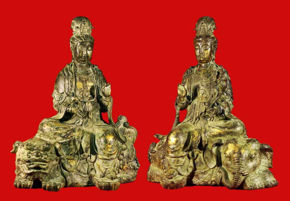 พระมัญชุศรีโพธิสัตว์ และพระสมันตภัทรโพธิสัตว์ หน้าฐาน 9 นิ้ว สูง 11 นิ้ว...พระสมันตภัทรโพธิสัตว์ (SAMANTABHADRA BODHISATTVA) หรือผู่เสียนผูซ่า(普贤菩萨) ในสำเนียงแต้จิ๋วนิยมเรียกว่า โผวเฮี้ยงผ่อสัก บ้างเรียกพระนามอีกแบบหนึ่งว่า เปียนจี๋ผูซ่า(遍吉菩萨) พระองค์ทรงเป็นพระอัครสาวกเบื้องขวาของพระศากยมุนีพุทธเจ้า ในขณะที่พระมัญชุศรีโพธิสัตว์เป็นพระอัครสาวกเบื้องซ้าย ดังนั้น ในคตินิยมทางพุทธศิลป์จึงนิยมการสร้างประติมากรรมหรือจิตรกรรมรูปพระศากยมุนีพุทธเจ้า พระสมันตภัทรโพธิสัตว์ และพระมัญชุศรีโพธิสัตว์ เรียกกันเป็นองค์สาม อันเป็นสัญลักษณ์แห่งแดนสุขาวดี เรียกกันว่า ฮว๋าเอี๋ยนซานเสิ้ง(华严三圣)... พระมัญชุศรีมหาโพธิสัตว์ (मञ्जुश्री) หรือ มัญชุศิริมหาสัตวะ ทรงเป็น ๑ ใน ๔ อัครมหาโพธิสัตว์แห่งพระพุทธศาสนามหายาน อันประกอบไปด้วย พระอวโลกิเตศวรมหาโพธิสัตว์ (มหากรุณา), พระมัญชุศรีมหาโพธิสัตว์ (มหาปัญญา), พระกษิติครรภมหาโพธิสัตว์ (มหาปณิธาน) และพระสมันตภัทรมหาโพธิสัตว์ (มหากิริยา) ทั้งยังเป็น ๑ ใน ๘ อัครมหาโพธิสัตว์แห่งพระพุทธศาสนาวัชรยาน ทรงเป็น ๑ ใน ๓ มหาบุรุษแห่ง พุทธาวตังสกโลกธาตุ และยังเป็นอัครสาวกข้างซ้ายฝ่ายพระโพธิสัตว์แห่งพระศากยกมุนีพุทธเจ้าอีกด้วย... |