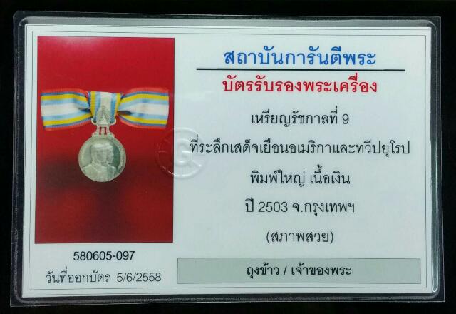 เหรียญเสด็จฯ เยือนสหรัฐอเมริกาและทวีปยุโรป ๒๕๐๓ เนื้อเงิน เป็นเหรียญราชอิสริยาภรณ์ ประเภทเหรียญพระราชทานที่ระลึก จัดสร้างขึ้นในวโรกาสที่พระบาทสมเด็จพระเจ้าอยู่หัว และสมเด็จพระนางเจ้าฯ พระบรมราชินีนาถ เสด็จฯ เยือนประเทศสหรัฐอเมริกา และทวีปยุโรป รวม ๑๕ ประเทศ ตั้งแต่วันที่ ๑๔ มิถุนายน ๒๕๐๓ และเสด็จนิวัติสู่พระนครเมื่อวันที่ ๑๘ มกราคม ๒๕๐๔ เหรียญนี้สั่งทำจากต่างประเทศขอบเหรียญจะเป็นเส้นซึ่งต่างจากบล้อกที่ทำในประเทศไทย เหรียญพระบรมรูปพระบาทสมเด็จพระเจ้าอยู่หัว นับเป็นสิ่งมงคลสักการะอันสูงสุด |