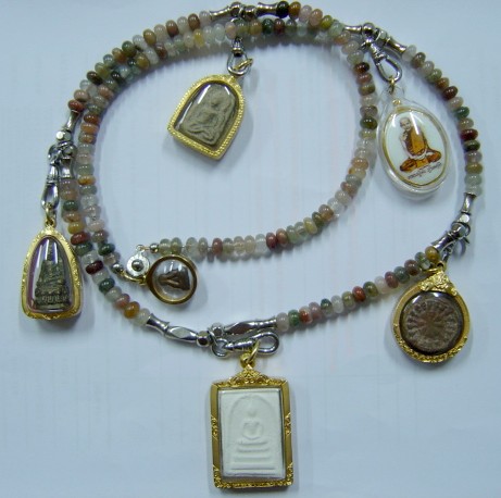 ชุดแรก เป็นหิน ไหม ๕สี พร้อมพระเครื่องที่สะสม ๑ ชุด ประกอบไปด้วย