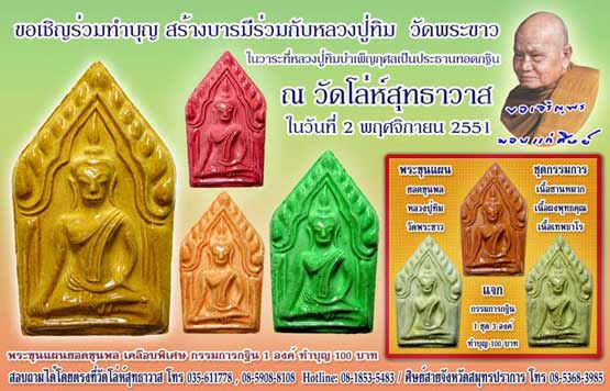พระครูนิเทศก์ธรรมรส กล่าวว่า การจัดงานครั้งนี้ นอกจากประชาชนทั่วไปได้ร่วมพิธีครอบมงคลดวงมหาชินบัญชร 108 คาบ เพื่อความเป็นสิริมงคลแล้ว ยังได้ร่วมบุญบูชาพระขุนแผนของหลวงปู่ทิม วัดพระขาวด้วย ในปัจจุบันนี้เราไม่สามารถจะหาพระขุนแผนเคลือบของเก่ากรุวัดใหญ่ชัยมงคลไว้ชื่นชมบูชาได้ เพราะมีจำนวนน้อยและหาบูชายากมาก บัดนี้ได้กำเนิดพระขุนแผนเคลือบขึ้นมาอีกรุ่นหนึ่ง จากการดำริของ หลวงปู่ทิม วัดพระขาว จ.พระนครศรีอยุธยา ให้จัดสร้างขึ้นเพื่อเป็นที่ระลึกในคราวที่ท่านบำเพ็ญกุศลเป็นประธานทอดกฐิน ณ วัดโล่สุทธาวาส จ.อ่างทอง ในวันที่ 2 พ.ย.2551 โดยจะแจกจ่ายแก่ผู้ที่ร่วมบุญสร้างบารมีกับหลวงปู่ทิม