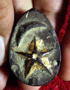 1.ชิ้นแรกเริ่มด้วยดาวเคียงเดือน(เปาบุ้นจิ้น) ยุคต้นครับ ยุคนี้กดบล็อคด้วยมือทีละด้านแล้วนำมาประกบกัน เราดูขอบจะเห็นเป็นรอยปะกบกันครับ หายากมากๆ โดยส่วนใหญ่จะเจอบล็อคปั๊มเครื่อง ซึ้งขอบนั้นจะมีรอยตัดขาดไปทีเดียวครับ. |