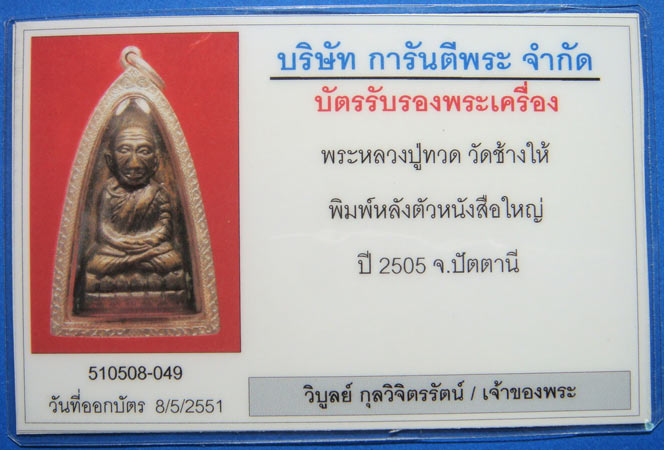 พระหลวงปู่ทวดหลังหนังสือ พิมพ์ใหญ่ ปี 2505 วัดช้างให้ เลี่ยมเงิน +บัตรรับรองการันตีพระ ถึงราคาขั้นต่ำ 10100 บาท รีบเปิดเข้าไปดูและร่วมประมูล กดไปตูมเดียว 11000 บาท กะว่าราคานี้ได้ก็เอา
