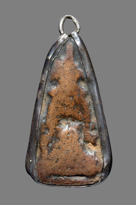 พระสรรค์นั่ง พิมพ์ไหล่ตรงข้างเม็ด เนื้อดิน พร้อมกรอบสแตนเลสอย่างดี |