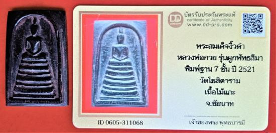 **120** พระสมเด็จงิ้วดำ หลวงพ่อกวย รุ่นผูกพัทธสีมา พิมพ์ฐาน 7 ชั้น ปี 2521 วัดโฆสิตาราม เนื้อไม้แกะ + บัตรรับรอง |