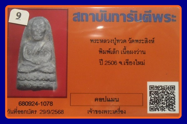บัตรการันตี -1000-หลวงปู่ทวดวัดพระสิงห์ พิมพ์เล็ก เนื้อว่าน ปี 2506 ( อ.ทิม วัดช้างไห้ จัดสร้าง ) |