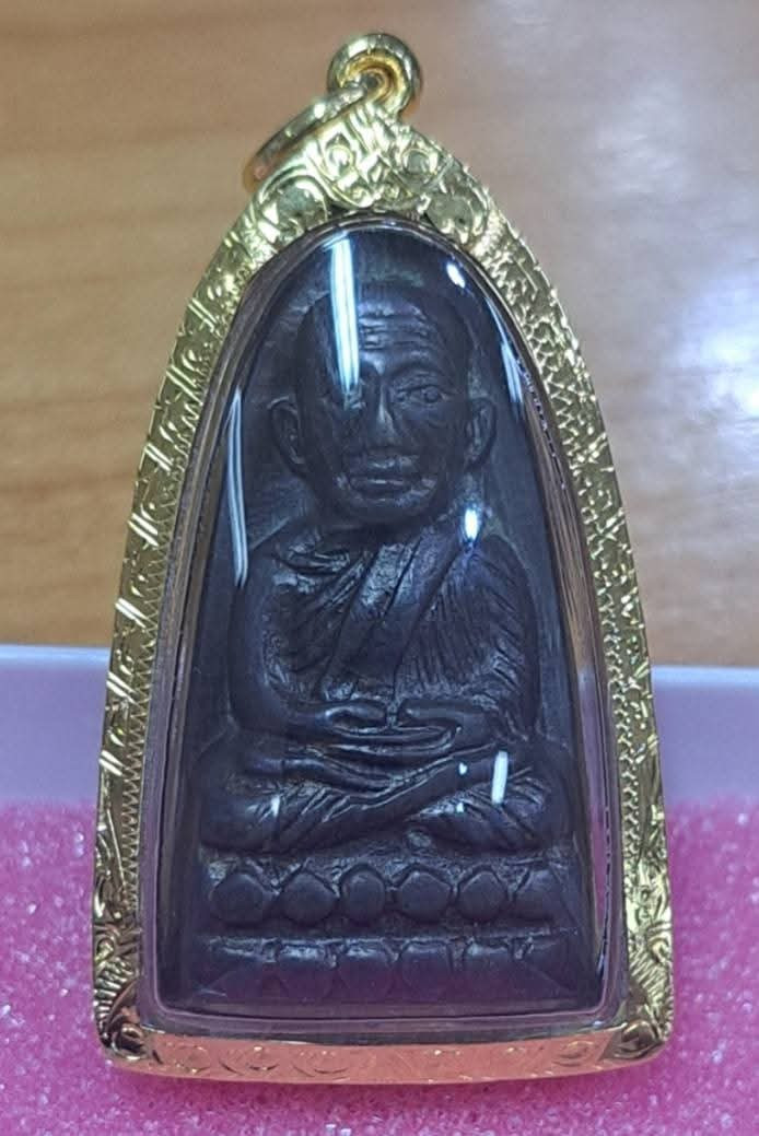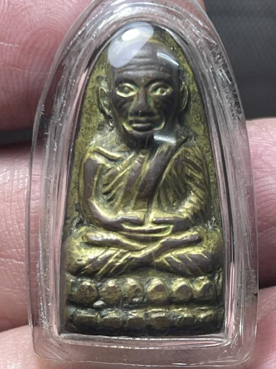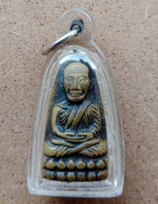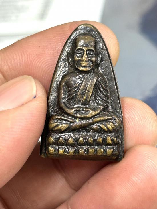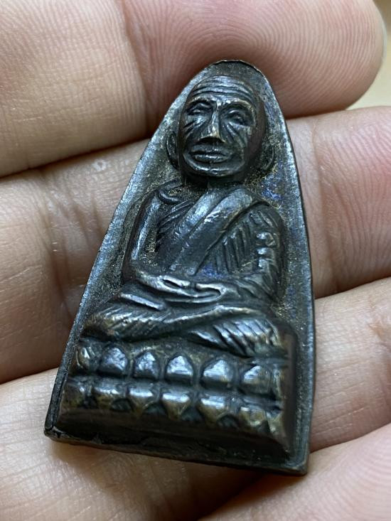 หลวงปู่ทวดปั้ม พิมพ์เตารีด-ปรกโพธิ์ หลังหนังสือ ก้นกลึง อุดกริ่ง (นิยมที่สุด) เนื้อทองเหลืองรมดำ รุ่นแรก วัดพะโค้ะ ปี 2506 |