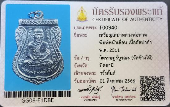 เคาะเดียวไวไว เหรียญเลื่อน หลวงพ่อทวด 101 ปี อาจารย์ทิม เนื้อทองขาว (อัลปาก้า)กรรมการ 2โค๊ต สวยพร้อมกล่องเดิมไม่ผ่านการใช้ (A2) |