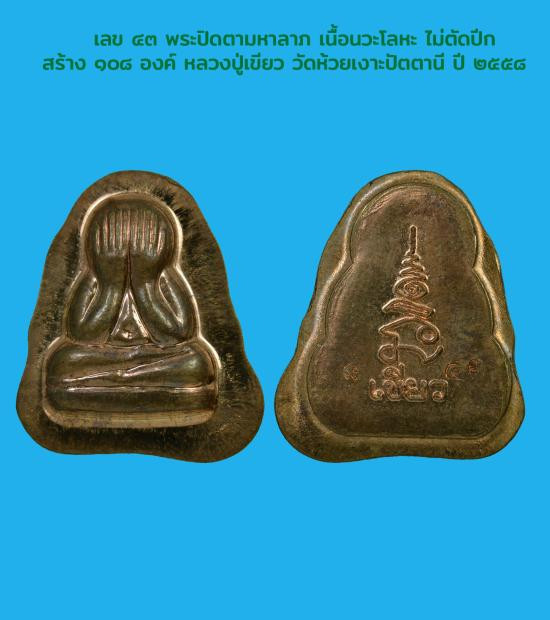 เลข ๔๓ พระปิดตามหาลาภ เนื้อเงิน หลวงปู่เขียว วัดห้วยเงาะปัตตานี ปี ๒๕๕๘ |