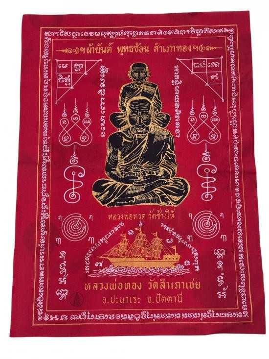 เคาะเดียวไวไว 2ผืน ผ้ายันต์พุทธซ้อนสำเภาทอง ขนาด9นิ้วx11.5นิ้ว หลวงพ่อทวด รุ่นพระธาตุเจดีย์ อาจารย์ทอง วัดสำเภาเชย ปัตตานี สีแดง+สีเขียว สวยๆไม่ผานการใช้ |