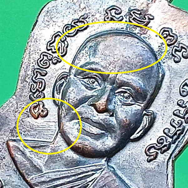 #3 สวยผิวเดิมรุ้งๆ บล็อกเขยื้อน เส้นข้างคอ ห้าห้าจุด เหรียญเสมาใหญ่ ปลุกเสกประจำปี 2555 พิมพ์เสมาหน้าเลื่อนหลังเลื่อน บล็อกเขยื้อน เหรียญนี้มีเส้นรางคู่ ข้างๆ คอพระอาจารย์ทิม บล็อกเขยื้อนคมชัดสวยเดิม |