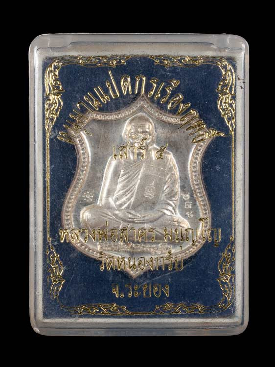 วัดใจ เหรียญเสมา 6 รอบ หลวงพ่อสาคร วัดหนองกรับ เนื้อเงินลงยาราชาวดี (กล่องเดิม) ยังไม่แกะซีล |