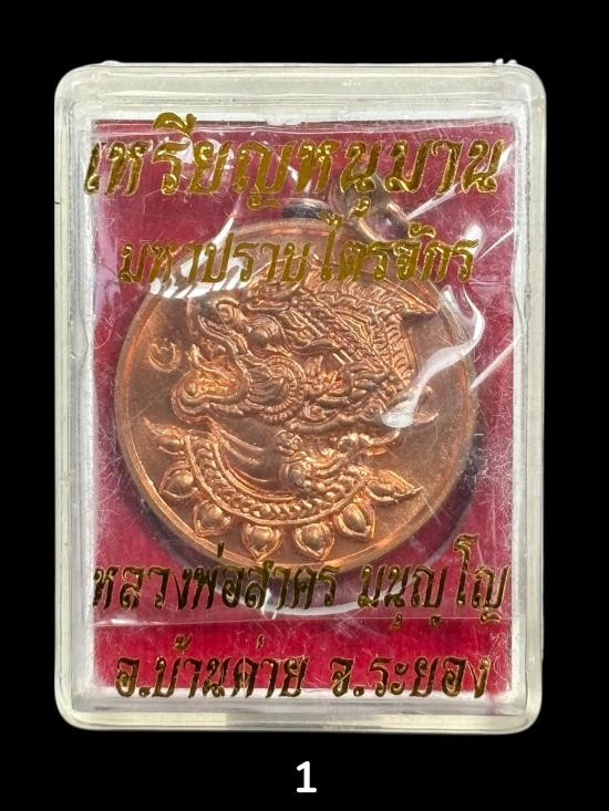 เหรียญ มหาโภคทรัพย์ หลวงพ่อสาคร วัดหนองกรับ เนื้อสวิป หมายเลข 5343 เลี่ยมกรอเงินลงยา ไม่มีกล่อง |