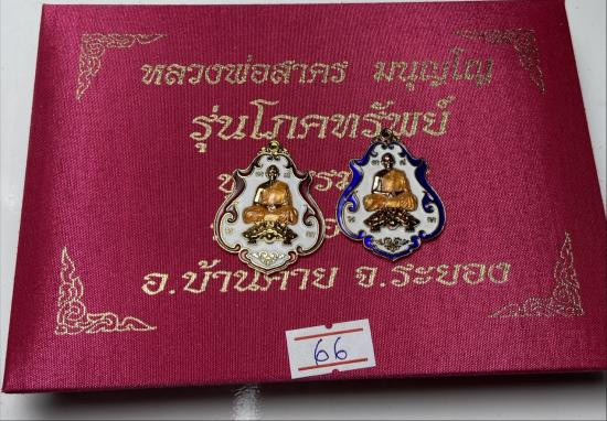 แยกชุดกรรม เลข๖๖ ผู้ชนะรับพระ 2 องค์ เหรียญโภคทรัพย์ ลพ สาคร ปี 2552 เนื้อกะไหล่ทอง ลงยาแดง+กะไหล่นาค ลงยาน้ำเงิน หายากมากเพราะสร้างไว้ในเฉพาะในชุดกรรมการที่มีเพียง 300 เท่านั้น เลข 66 มีเพียง 1 เดียว |