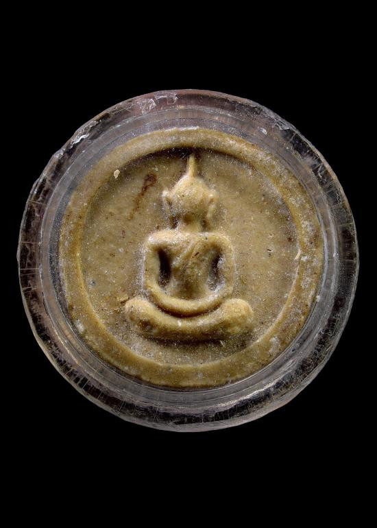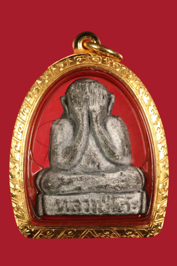 ปิดตาข้าวตอกแตกเนื้อตะกั่ว หลังเรียบ เลี่ยมพลาสติก ผิวปรอท + บัตรรับรอง |