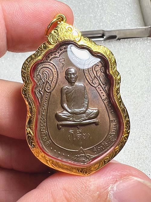 เหรียญหลวงปู่โต๊ะ วัดประดู่ฉิมพลี พิมพ์หลังพัดยศ(รูปไข่อุ้มดาว) เนื้อทองแดง ปี 2518 เลี่ยมทอง |