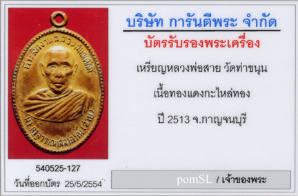 หลวงพ่อกัน วัดเขาแก้ว พ.ศ.2499 สภาพใช้ตามรูป พร้อมบัตรการันตีรับรอง |