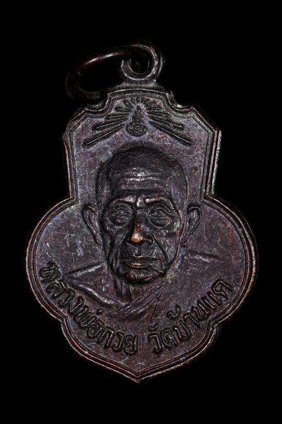 เหรียญหลวงพ่อกวย ปี 2515 รุ่น ยกช่อฟ้า วัดเดิมบาง เนื้อทองแดงรมดำ ไหล่จุด หูขีด พร้อมบัตรรับรองพระเครื่องของสถาบันการันตีพระ |