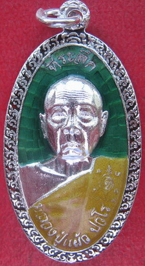 เหรียญใบขี้เหล็กหลังส.ก. หลวงปู่แผ้ว ปวโร เนื้อเงินลงยา ปี2556 พร้อมกล่องครับ |