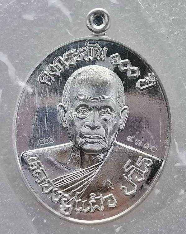 เหรียญคงกระพัน ยันต์กลับ อายุ 100 ปี หลวงปู่แผ้ว ปวโร วัดรางหมัน เนื้อเงิน พร้อมกล่อง + จีวร,สายสิญจน์ |