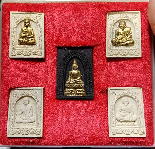 ***138..........***พระเนื้อผงพุทธคุณ ใต้ร่มไทร ชุด 5 องค์ หลวงพ่อเปิ่น วัดบางพระ ปลุกเสก ๕ ธันวาคม ๒๕๔๒ สวยกล่องเดิม |