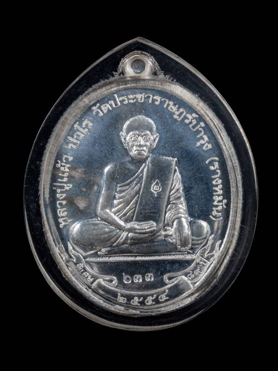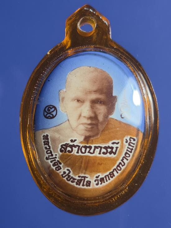 เหรียญบารมีสูง หลวงปู่แผ้ว ปวโร วัดรางหมัน จ.นครปฐม เลี่ยมใส่จีวรสายสิญจน์ |