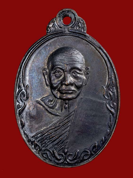 เหรียญรูปไข่ รุ่นแรก หลวงปู่มหาเจิม วัดสระมงคล จ.นครปฐม เนื้อทองแดง ผิวติดรุ้ง ปี 2549 |