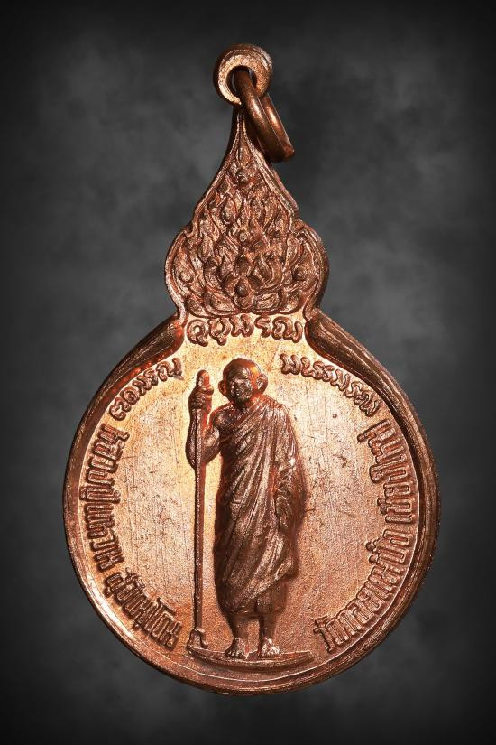 เหรียญยืนหลังพระปรมาภิไธยย่อ ภ.ป.ร. หลวงปู่แหวน สุจิณฺโณ วัดดอยแม่ปั๋ง อ.พร้าว จ.เชียงใหม่ ปี 2519 |