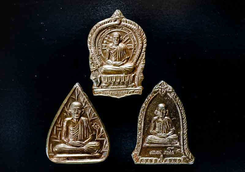 พระปรกใบมะขามหลวงปู่แหวน สุจิณโณ ปี 2521 จำนวน 3 องค์ เนื้อทองแดงรมดำ |