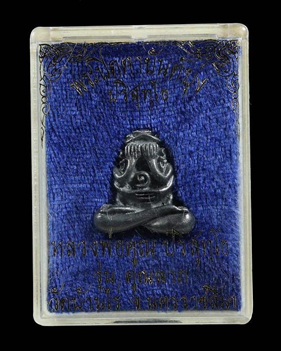 รูปหล่อเหมือนนั่งบริกรรมคาถา พิมพ์เล็ก รุ่น ให้ลาภ บรรจุผงไม้พญาคูนมหาสิทธิโชค อฐิษฐานจิตตลอดไตรมาส วัดบรูพ์ ( เนื้อเงิน ) พ.ศ.2533 กล่องเดิม |