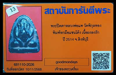 สมเด็จคะแนนหลวงพ่อแพวัดพิกุลทอง หลังยันต์ตรีนิสิงเหปี 12 มาพร้อมบัตรรับรอง |
