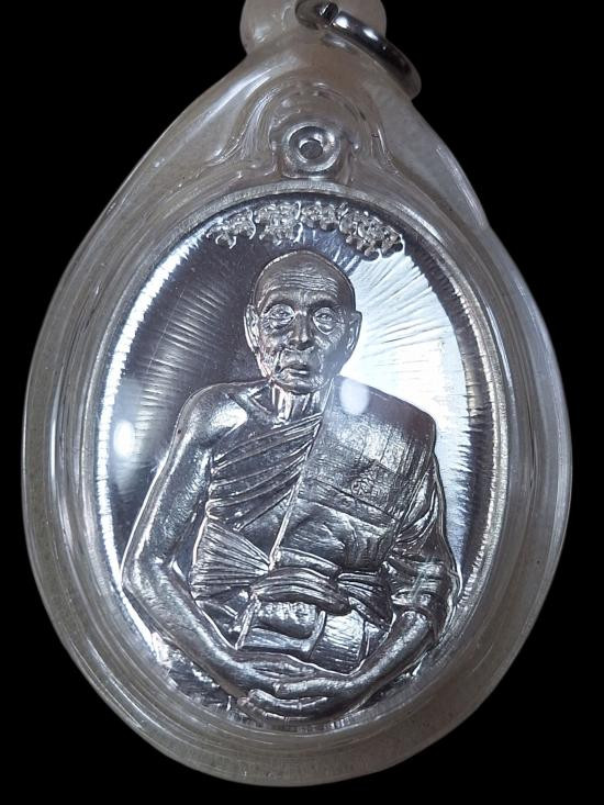 หลวงพ่อเพี้ยน วัดเกริ่นกฐิน รุ่นเพชรกลับทรัพย์ทวีเพิ่มพูน ฐานวงเดือน เสกไตรมาส ปี 55 เนื้อเงิน หมายเลข ๑๕๘๔ |