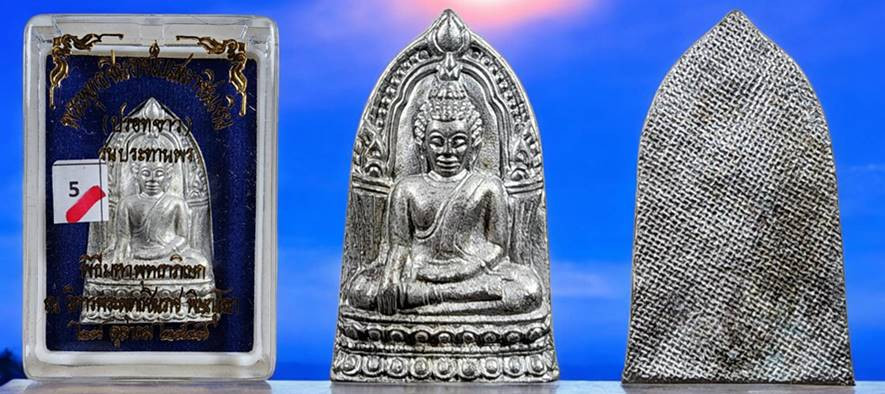 พระพุทธชินราชใบเสมา รุ่นประทานพร เนื้อชินเงิน หรือเนื้อปรอทขาว จัดสร้างขึ้นในปี 2547 มาพร้อมกล่องเดิมจากวัดครับ ข้างหลังด้านล่างตอกโค้ด นะ ขนาดองค์พระ สูง 4.0 ซม. กว้าง 2.5 ซม.ครับ 6 |