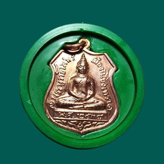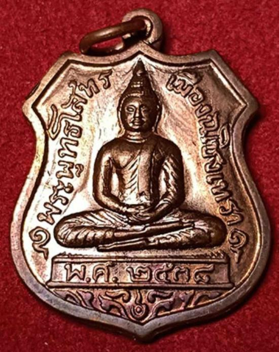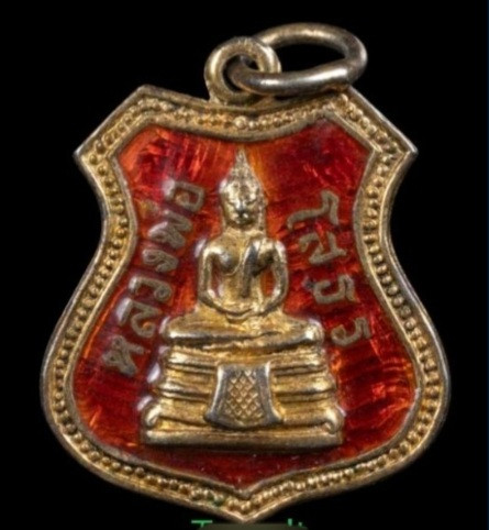( เลข 1388 ) เหรียญโล่ห์พระพุทธชินราช หลังยันต์วิเศษอกเลาโภคทรัพย์ เนื้อทองทิพย์ลงยาสีแดง รุ่น สมโภชพระพุทธชินราช ครบ ๖๖๖ ปี |