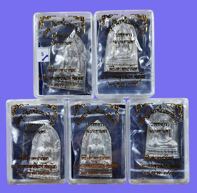 ( 5 องค์ ) พระพุทธชินราชใบเสมา รุ่นประทานพร เนื้อชินเงิน หรือเนื้อปรอทขาว จัดสร้างขึ้นในปี 2547 มาพร้อมกล่องเดิมจากวัดครับ 5 |