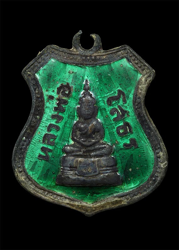 ( เลข 1365 ) เหรียญโล่ห์พระพุทธชินราช หลังยันต์วิเศษอกเลาโภคทรัพย์ เนื้อทองทิพย์ลงยาสีเขียว เหนี่ยวทรัพย์ รุ่น สมโภชพระพุทธชินราช ครบ ๖๖๖ ปี |