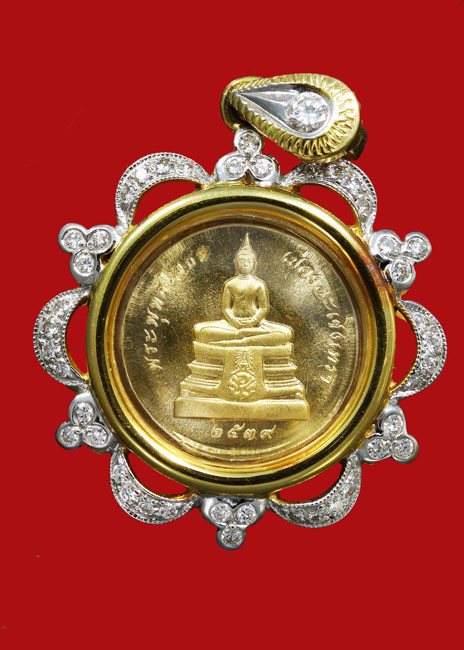พระพุทธโสธร รุ่นย้อนยุค สร้างพระอุโบสถ เนื้อทองคำบริสุทธิ์ 99.99% ขนาด 1.5 ซม. เลี่ยมทอง ล้อมเพชรแท้ |