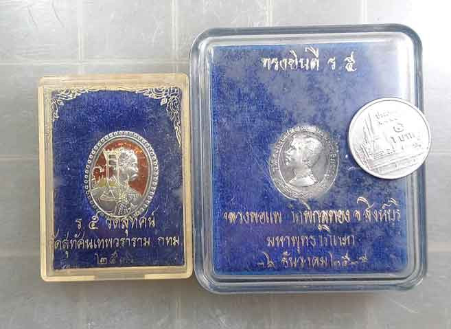 เหรียญร.5 เนื้อเงินลงยา วัดสุทัศน์ + เหรียญร.5 เนื้อเงินหลวงพ่อแพ วัดพิกุลทอง กล่องเดิม |