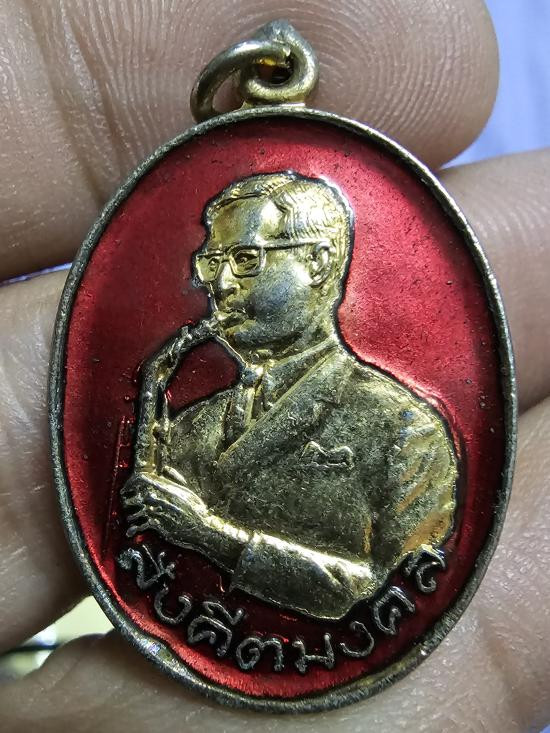 เหรียญในหลวงทรงแซ็ก รุ่นสร้างอาคารสดุดีมหาราชา ฉลองครบรอบ 21 ปี สมาคมดนตรีแห่งประเทศไทย ในพระบรมราชูปถัมภ์ เหรียญนี้เป็นเหรียญกะหลั่ยเงิน ลงยาสีแดง |