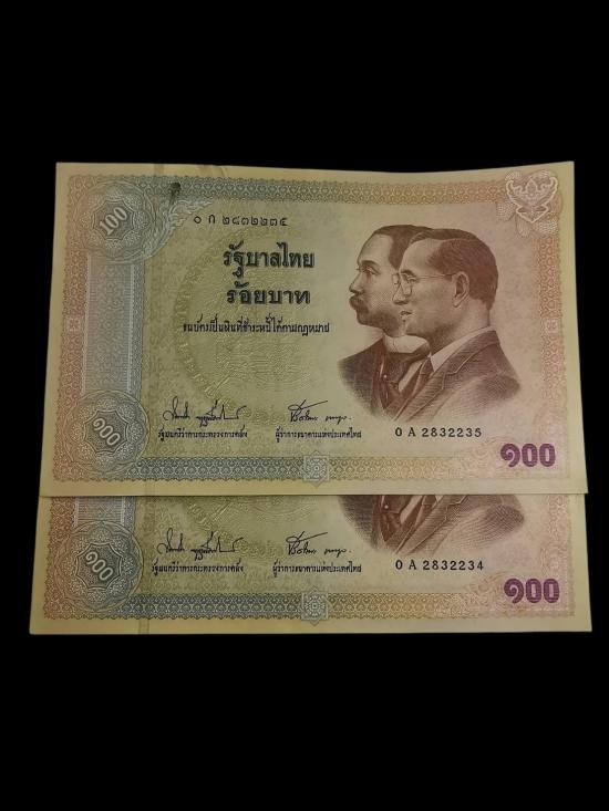 ธนบัตรที่ระลึก 100บาท ร.5+ร.9 ครบรอบ 100ปีธนบัตรไทย สภาพ UNC เลขเรียง 7ฉบับ สภาพสวย |