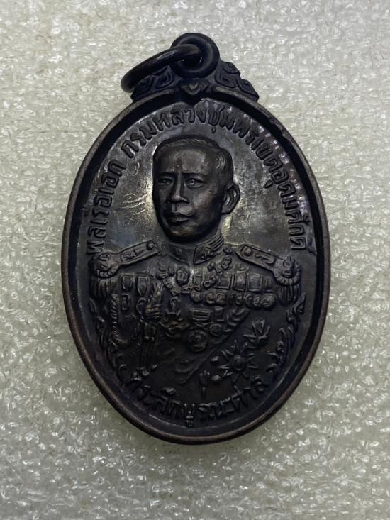 เหรียญกรมหลวงชุมพรเขตอุดมศักดิ์ ที่ระลึกบูรณะศาลเสด็จเตี่ย โดยมูลนิธิโรงเรียนเตรียมทหาร ปี 2530 เนื้อทองแดงรมดำ |