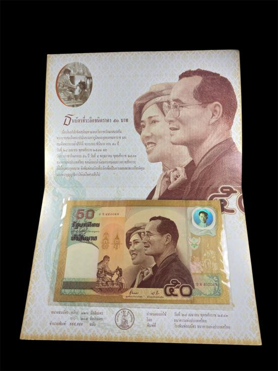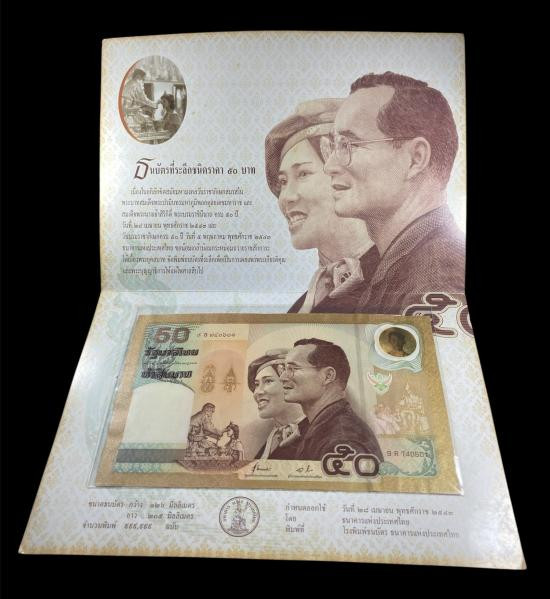 รายการี่ 1 ธนบัตรที่ระลึกชนิดราคา 50 บาท เนื่องในอภิลักขิตสมัยมหามงคลวันราชาภิเษกสมรส ครบ 50 ปี 28 เมษายน 2543 และวันบรมราชาภิเษกครบ 50 ปี 5 พฤษภาคม 2543 สวยๆ ครับ |