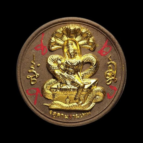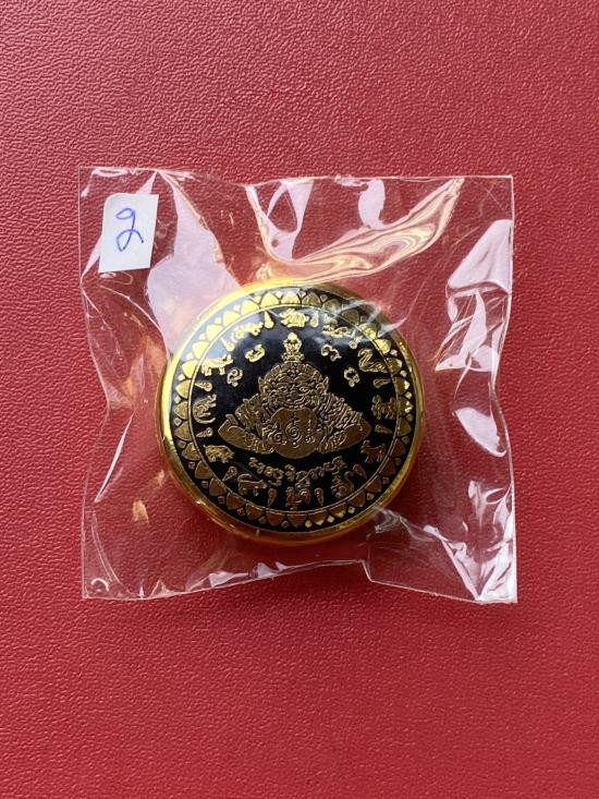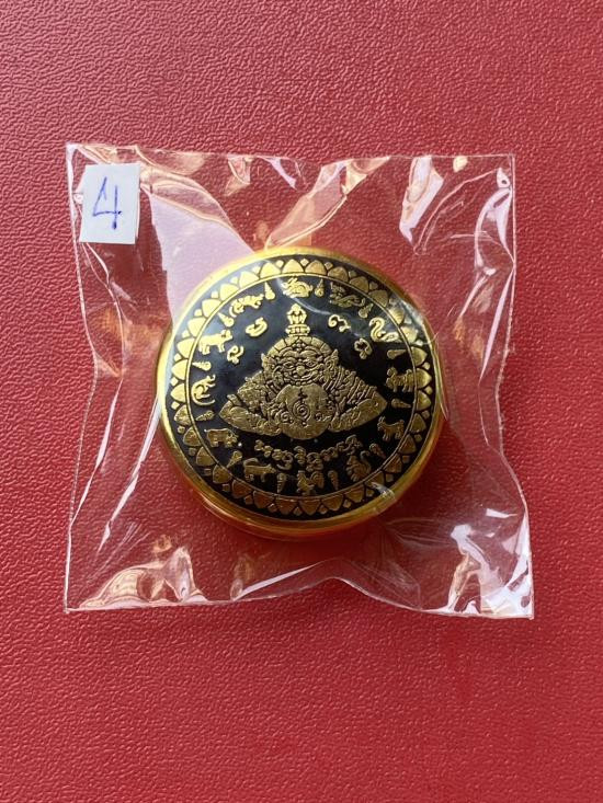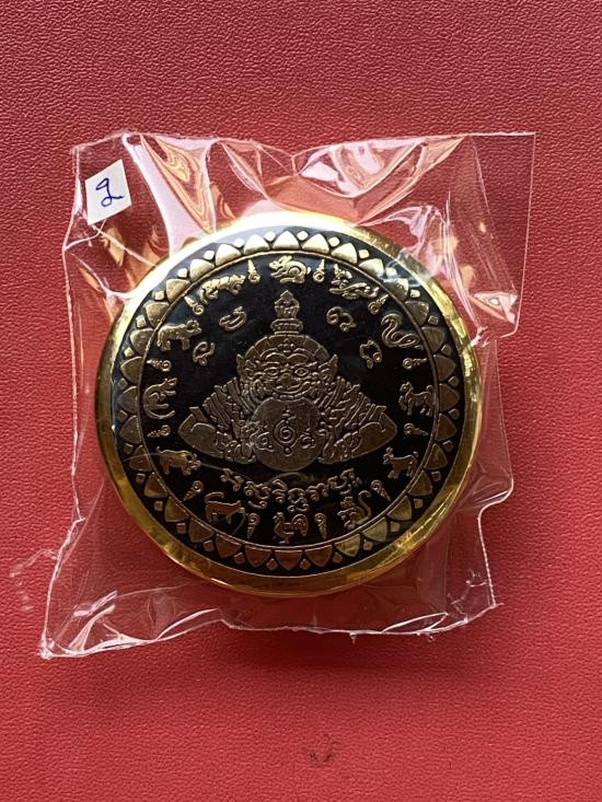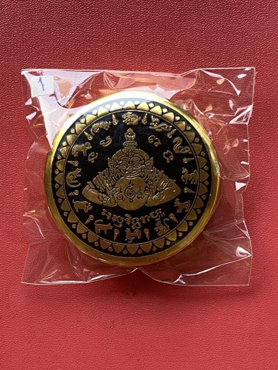 เคาะเดียวแดง สีผึ้งพระราหู รุ่น มงคลจักรวาล เนื้อ โลหะชุบทองลงยาสีดำขอบสีดำ ขนาด5ซม |
