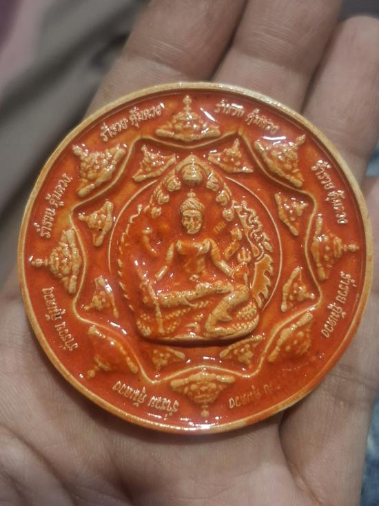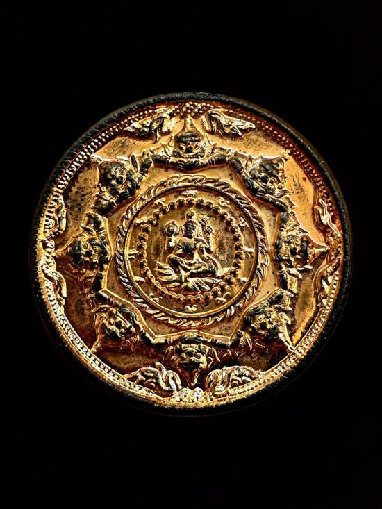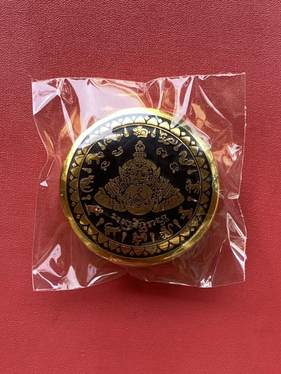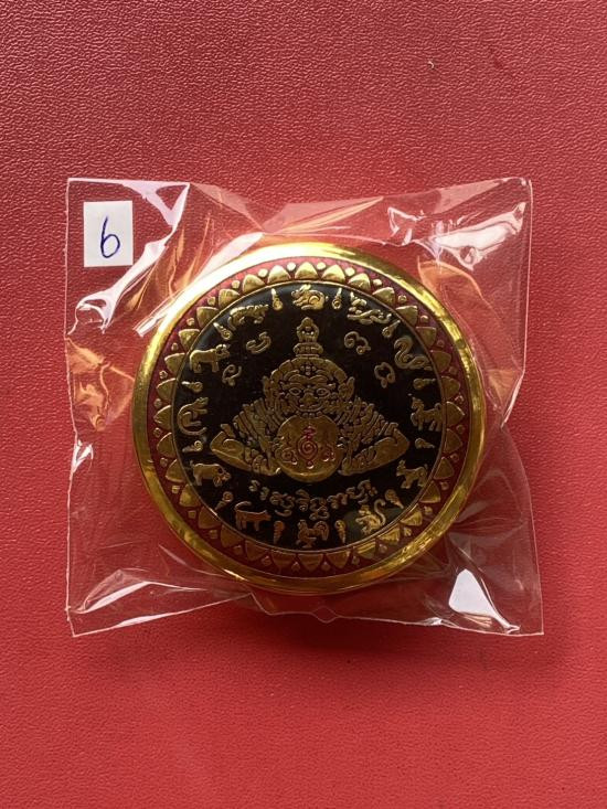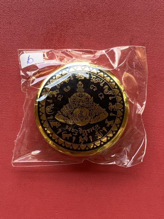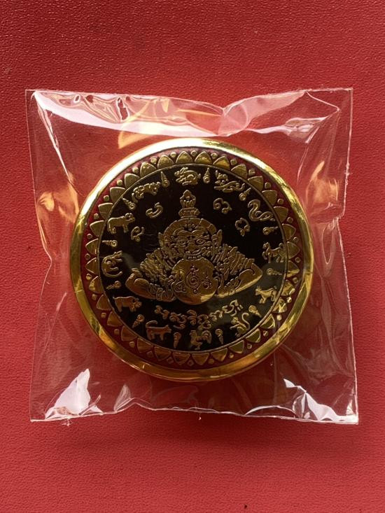 เคาะเดียวแดง สีผึ้งพระราหู รุ่น มงคลจักรวาล เนื้อ โลหะชุบทองลงยาสีดำขอบสีแดง ขนาด5ซม |