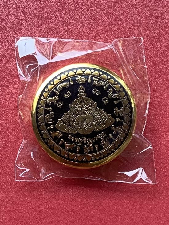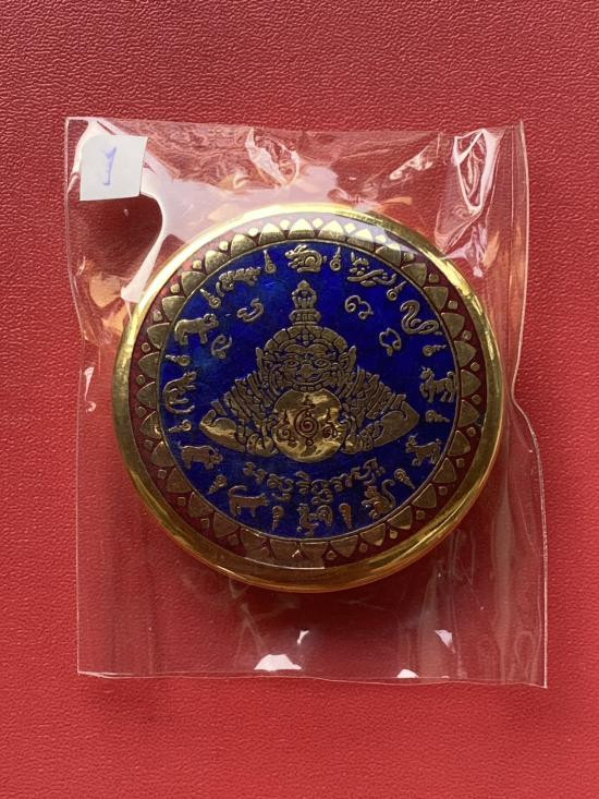 เคาะเดียวแดง สีผึ้งพระราหู รุ่น มงคลจักรวาล เนื้อ โลหะชุบทองลงยาสีน้ำเงิน ขอบสีแดง ขนาด 5ซม |