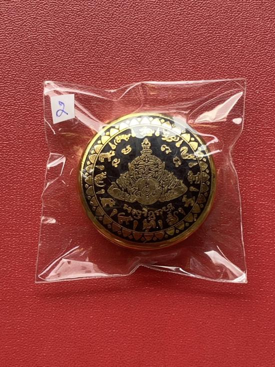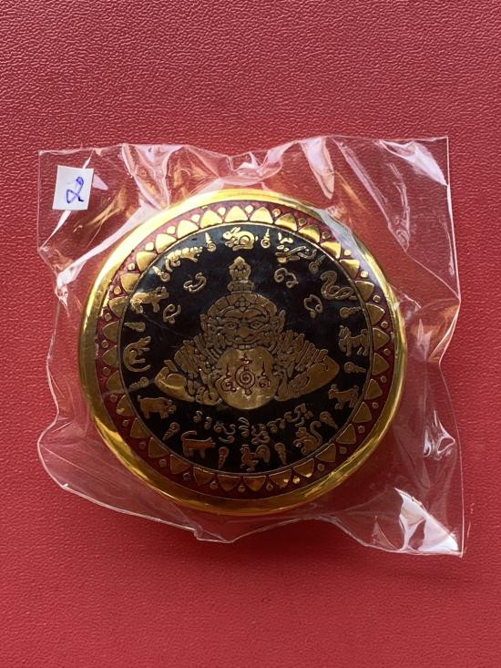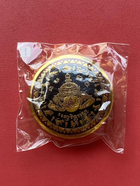 เคาะเดียวแดง สีผึ้งพระราหู รุ่น มงคลจักรวาล เนื้อ โลหะชุบทองลงยาสีดำขอบสีดำ ขนาด3.2ซม |