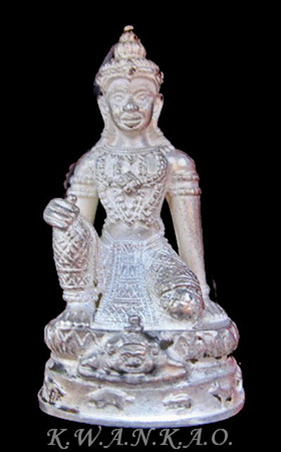 วัดใจ..หายากสุด..ท้าวกุเวรมหาราช (พระธนบดีศรีธรรมราช) ผู้ประทานโชคลาภและความมั่งคั่ง แห่งอาณาจักรทะเลใต้ รุ่นเจริญโภคทรัพย์ วัดชะเมา ปี 2548 เนื้อโลหะ รมดำ หมายเลข 79 ฐาน 10 นิ้ว |
