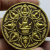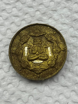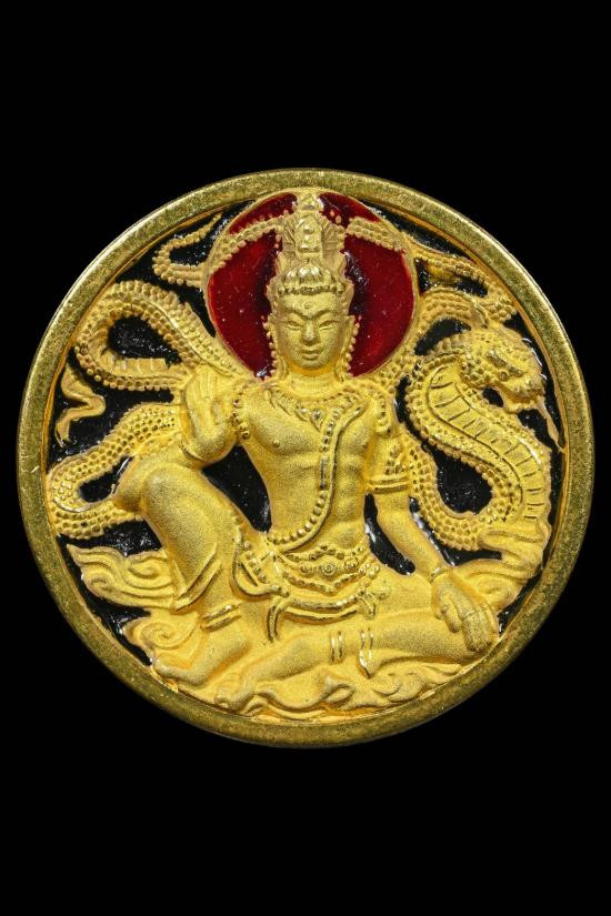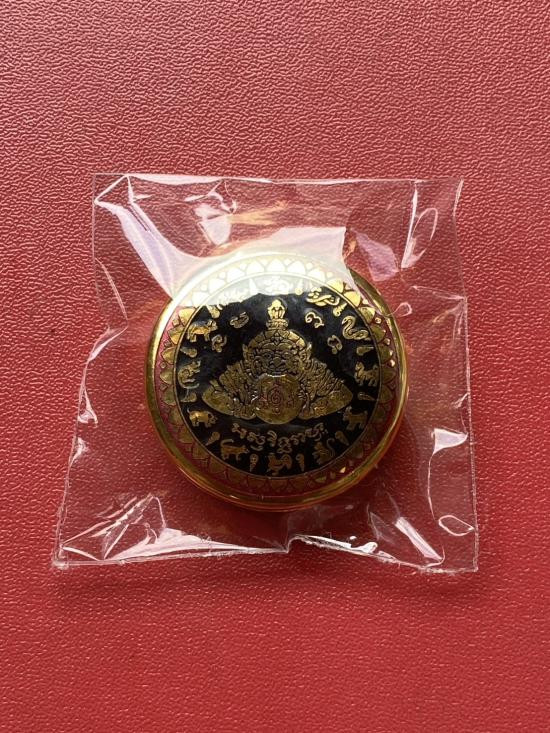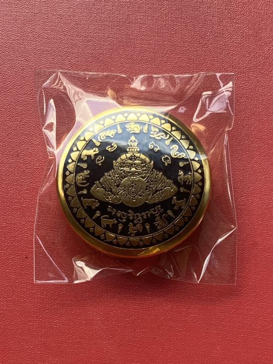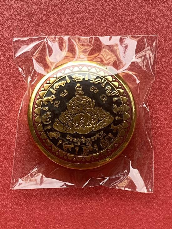 เคาะเดียวแดง สีผึ้งพระราหู รุ่น มงคลจักรวาล เนื้อ โลหะชุบทองลงยาสีดำขอบสีแดง ขนาด3.2ซม |