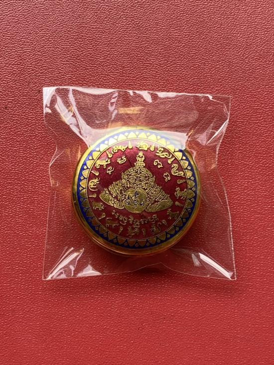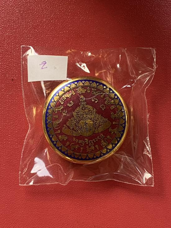 เคาะเดียวแดง สีผึ้งพระราหู รุ่น มงคลจักรวาล เนื้อ โลหะชุบทองลงยาแดงขอบน้ำเงิน ขนาด3.2ซม |